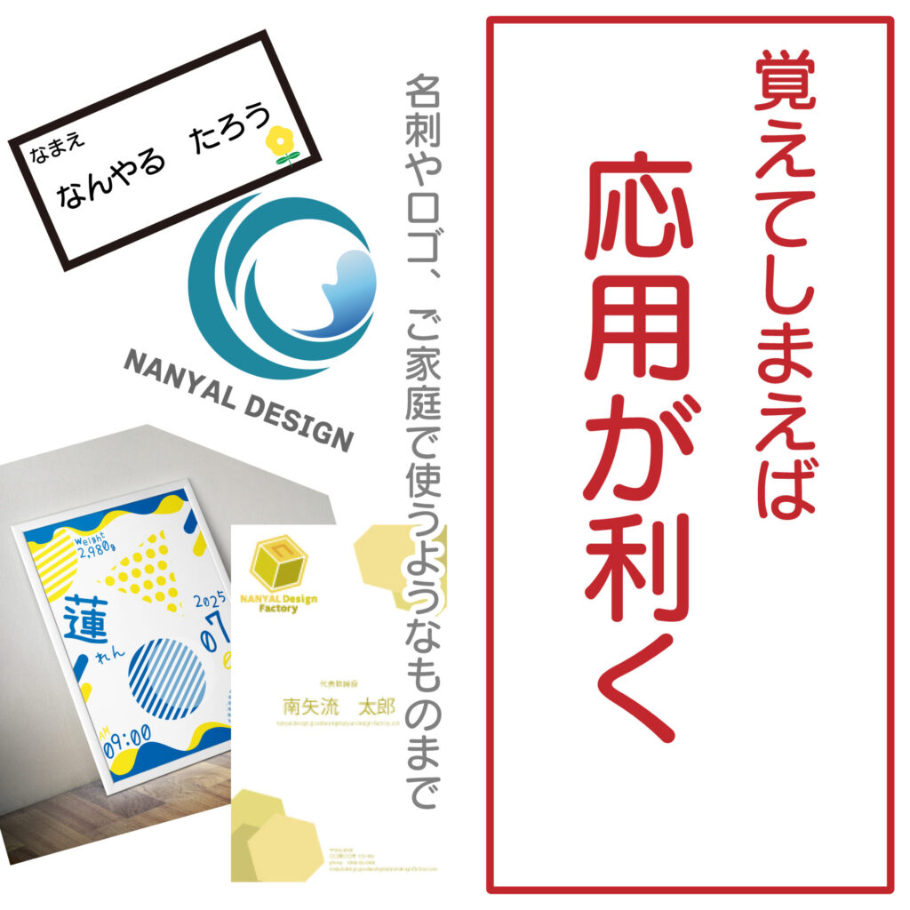 例えば、商品のパッケージ、ロゴ作成、チラシ作成、WEBのサムネイルや広告、自社のオリジナル商品開発や、自身のSNSのアイコンや貼り付ける画像など、お家用のポスターや、お子さんのネームシールなど、ご家庭の印刷物も作れるようになります。